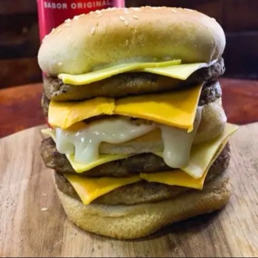 Pão, 4x carne, queijo cheddar, queijo prato e maionese temperada +batata 100g e refrigerante lata